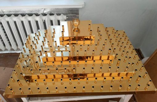 Данная крышка для панихидного стола изготовлена из булата, с распятием и подставкой под лампаду. Возможное количество мест для установки свечей 44-100шт. Панихидный стол неотъемлемый атрибут христианской церкви, на него устанавливают свечи в память об усопших и возносят молитвы. Церковная утварь, в частности панихидные столы, и крышки для них, обрамляются наиболее качественными материалами (нитрид титана), выбор которых можно совершить при оформлении заказа.